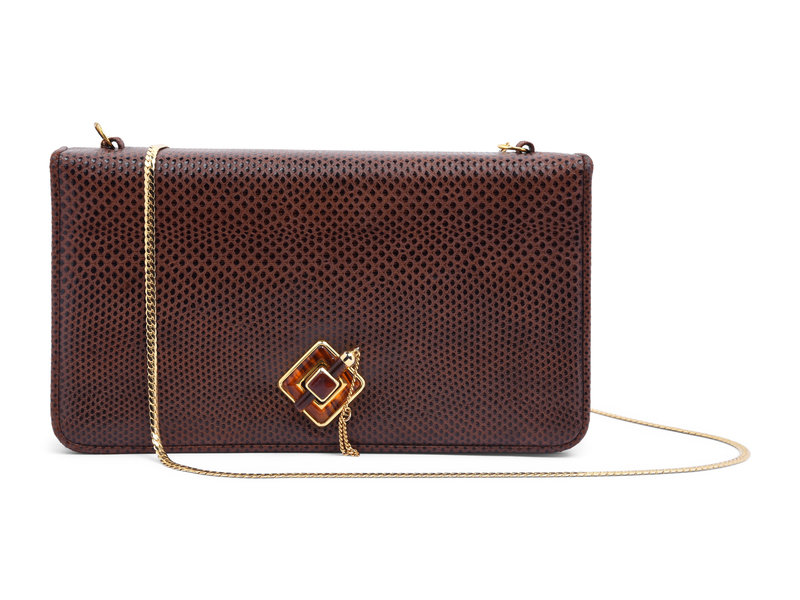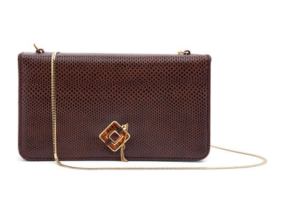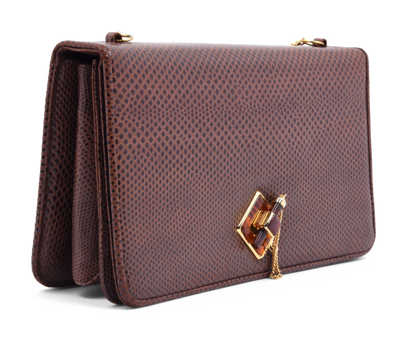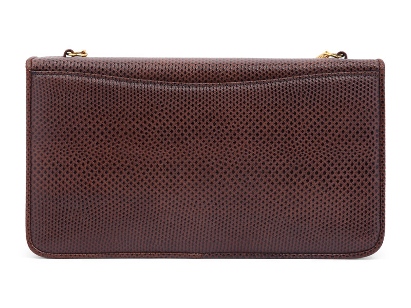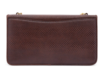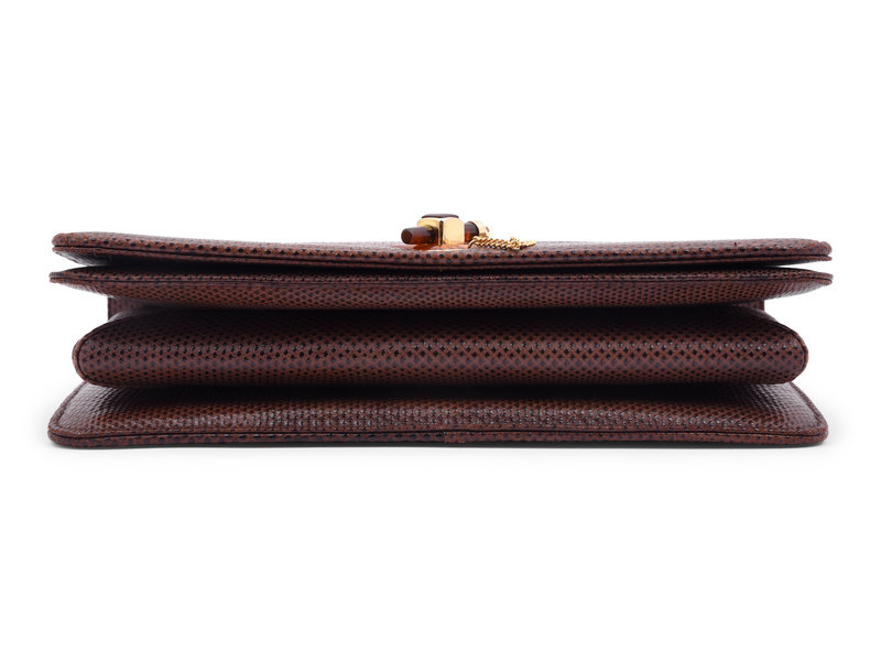 Brown lizard skin wallet shoulder bag with gold-tone chain and a faux tortoise 'lock and load' closure.