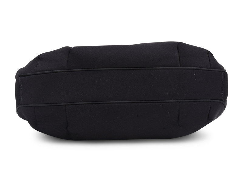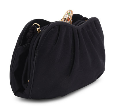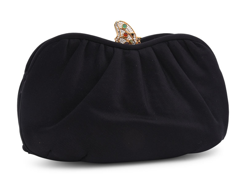 Black gathered satin clutch with a top butterfly clasp set with colored crystals and a black rope and tassel shoulder strap.