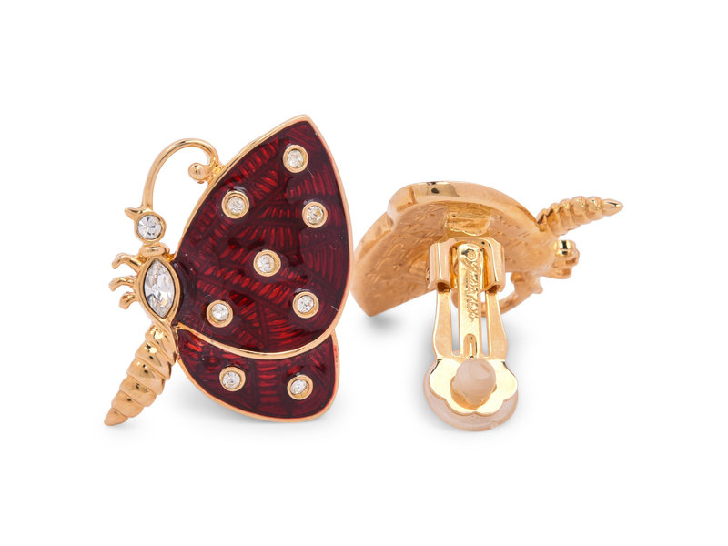 Butterfly shaped gold-tone metal ear clips set with red enamel and clear crystals. Box included.
