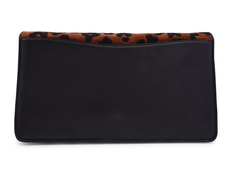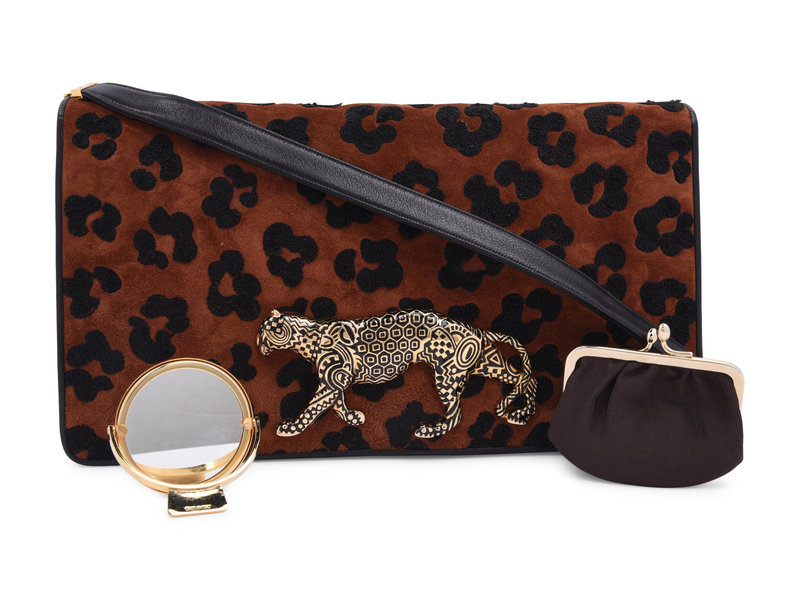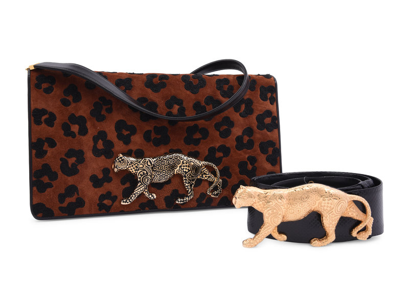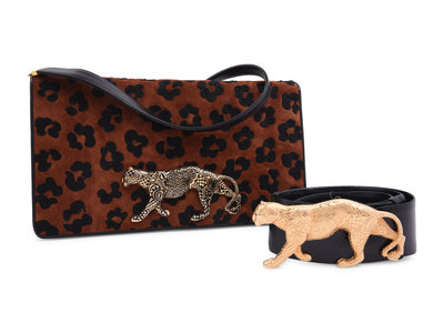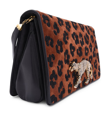 Leopard print suede clutch with large gold-tone leopard embellishment, detachable leather strap, and front magnet closure.