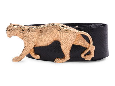 Black snake skin adjustable belt with a gold-tone leopard shaped prong buckle.