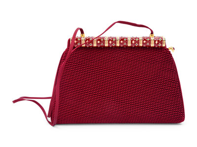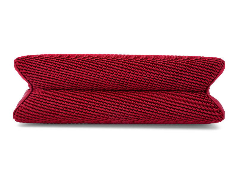 Red double pleated shoulder bag with red enamel and gold-tone metal embellished top frame set with multi-hued crystals, retractable satin shoulder strap, and side spring clasp.