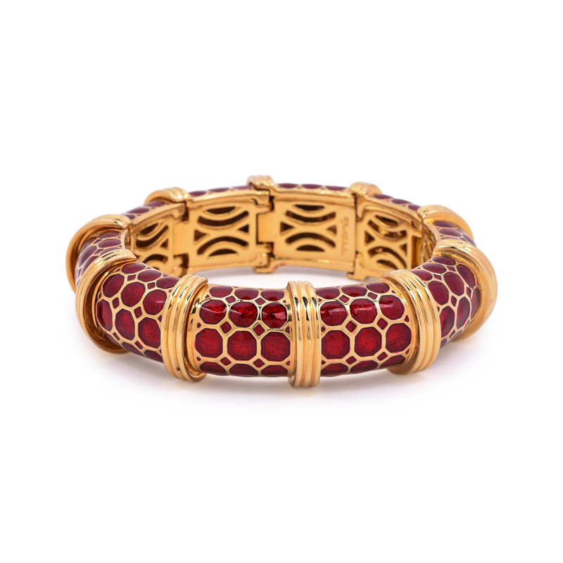 Red enamel covered gold-tone metal bangle with dot pattern. Box included.