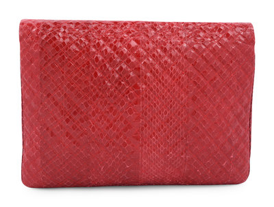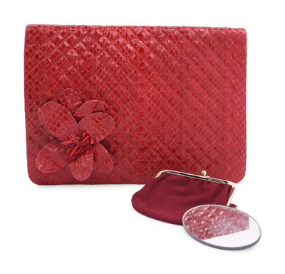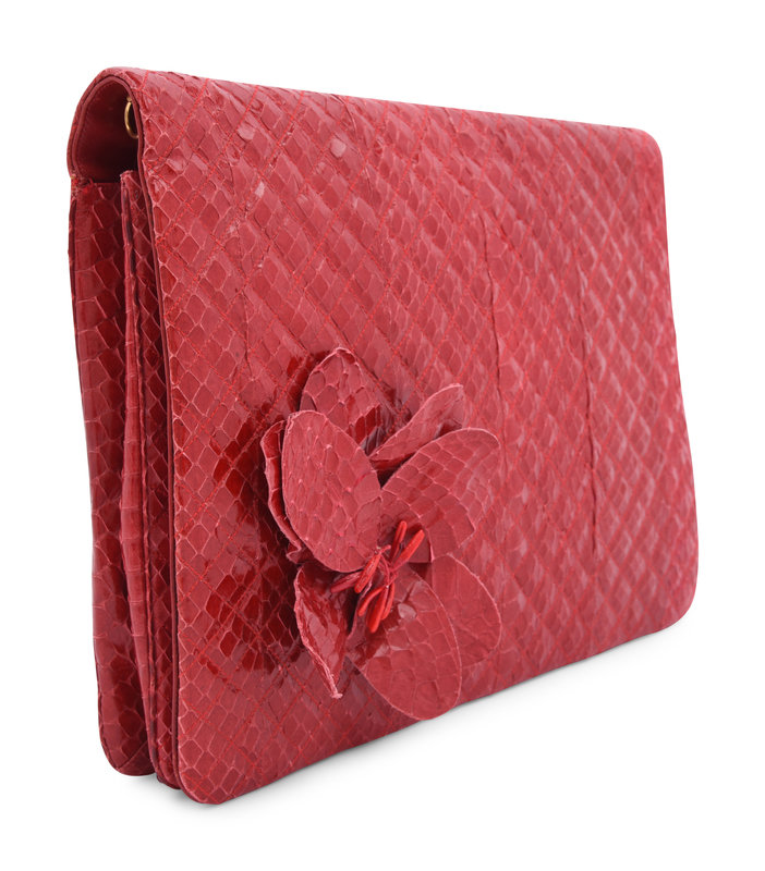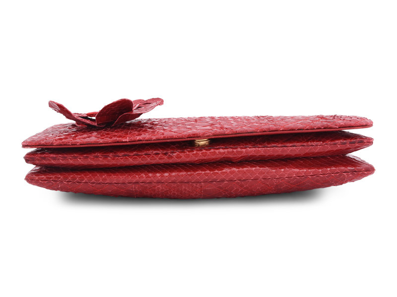 Red quilted snakeskin clutch with matching red petal flower on front, a matching detachable red snake skin shoulder strap, and magnetic snap closure.