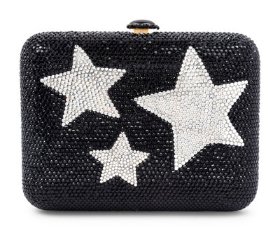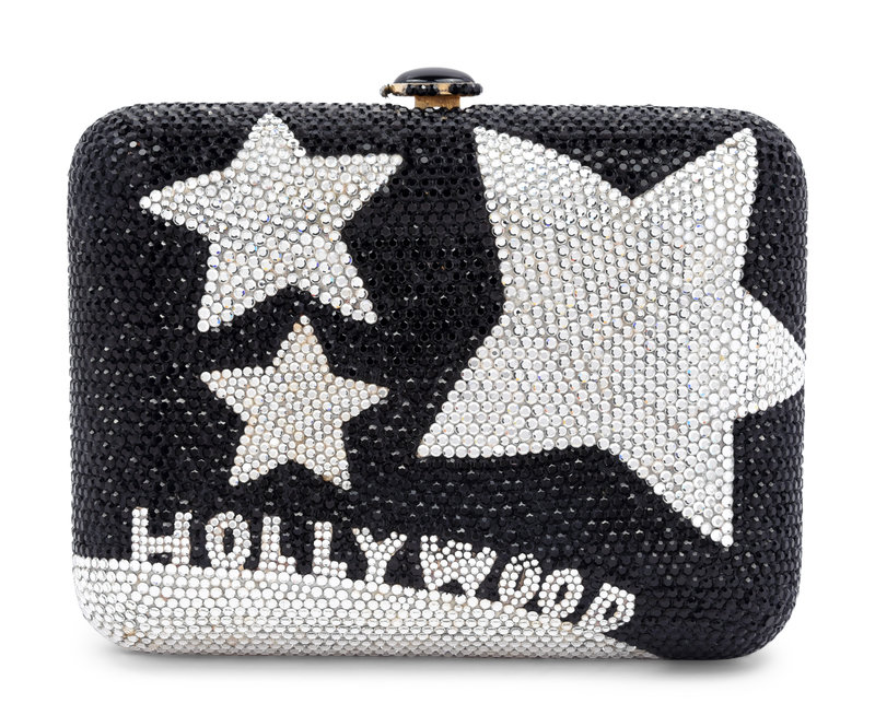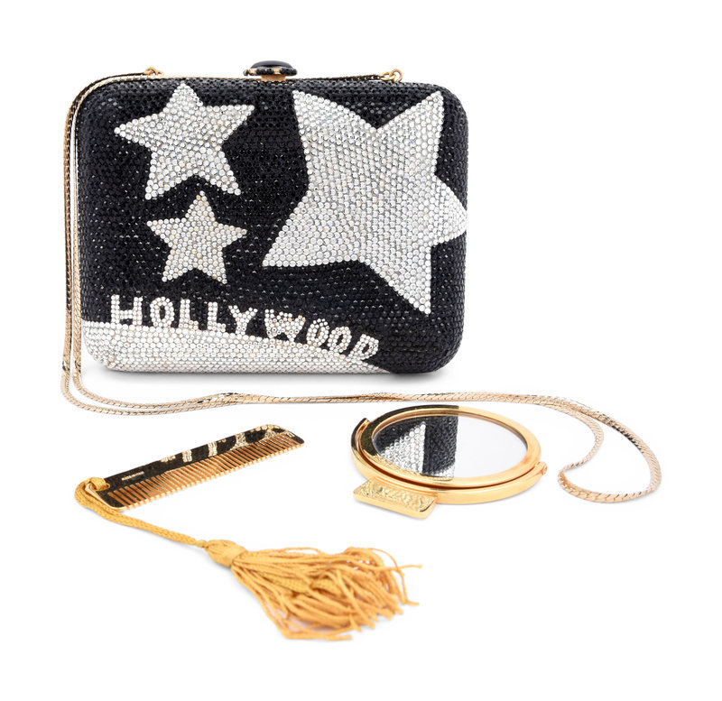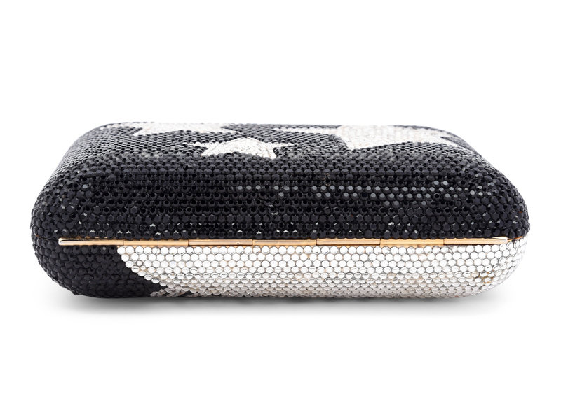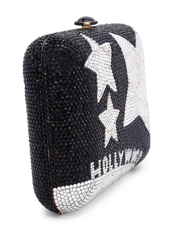 Hollywood theme minaudière bag in black and silver crystals, features a gold-tone metal chain shoulder strap.