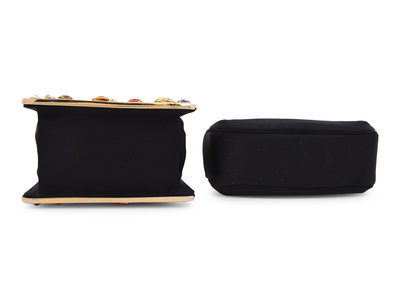 Black satin shoulder bag featuring a gold ebbed frame set with large colored crystals, and a gold-tone plated chain strap.