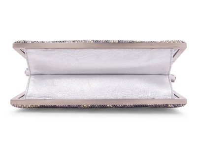 Purple, gold, and black crystal leopard pattern frame bag with metallic silver leather on silver-tone metal frame, retractable shoulder chain strap, and top hinged clasp closure. Found with original sales tag, listed price: $2,950.00.