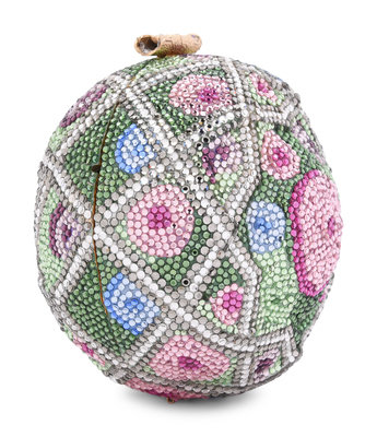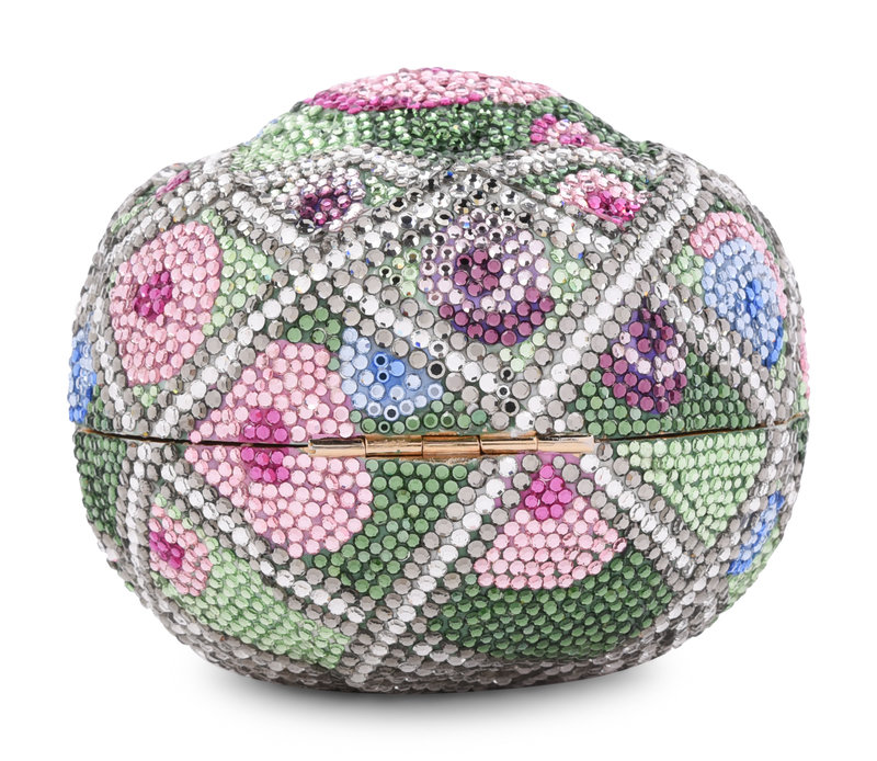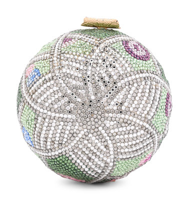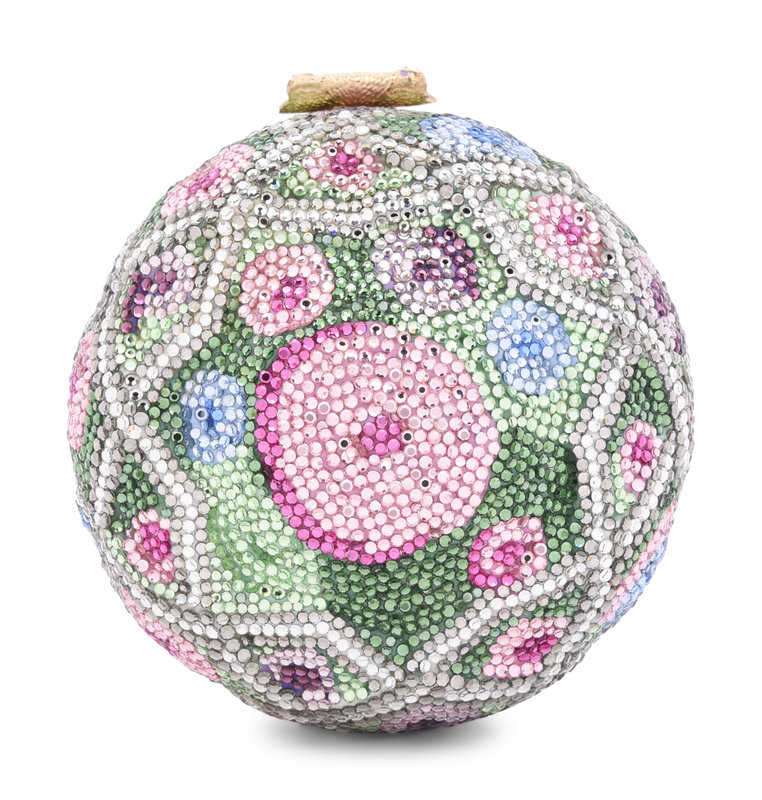 Circular green, pink, and blue floral motif minaudière with retractable shoulder strap, and front pressure clasp closure.