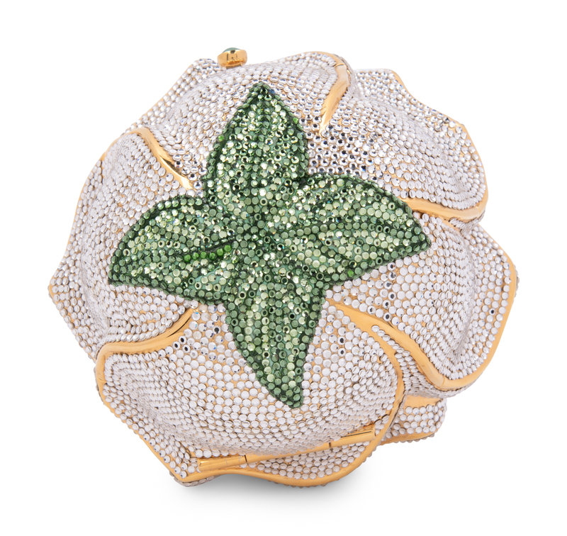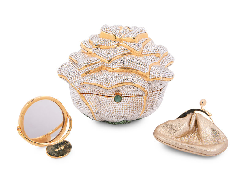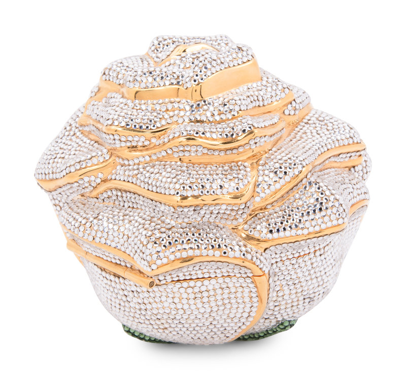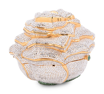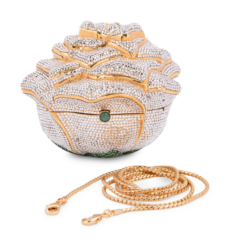 Gold-tone metal rose-shaped minaudière encrusted with clear crystals featuring silver crystals petals and green crystal leaves, retractable shoulder strap, and front pressure clasp.