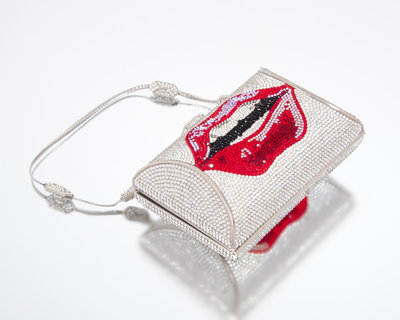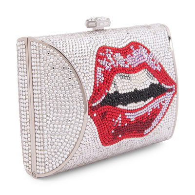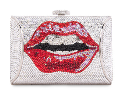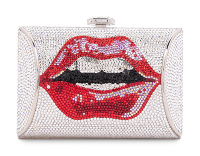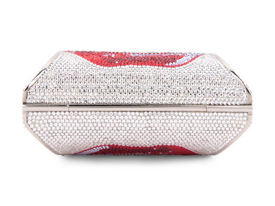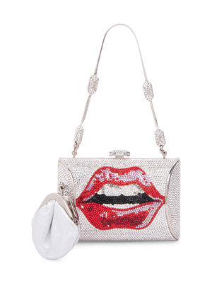 Rectangular silver-tone metal and clear crystal minaudière depicting red lips and a crystal-adorned chain handle.