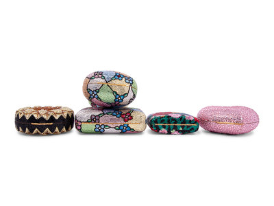 Main textile: Pink and multi-hued crystals on gold-tone metal