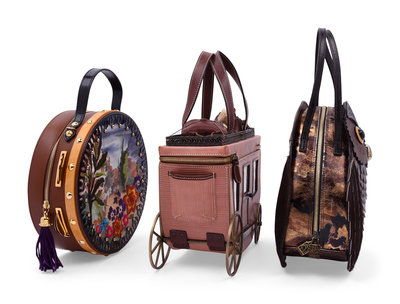 Pink stamped leather "Stage Coach" shaped hand bag embellished with antiqued brass top rack with miniature baggage, working spoked wheels on the base, dual top leather handles, and zip top closure. Found with original sales tag, listed price is missing. 2003.