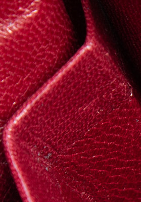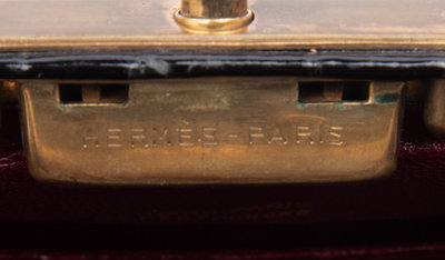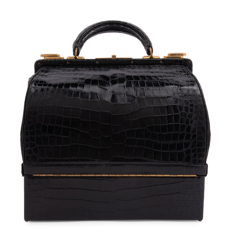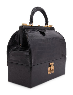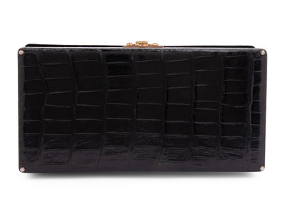 Black crocodile top frame bag with bottom hard case compartment lined in dark red leather, taffeta, and velvet pillow, top gold-tone push lock and front spring closure.
