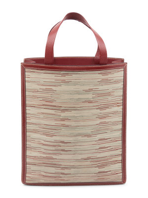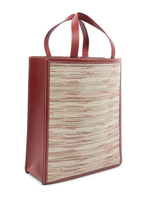 Vibrato leather shopper bag in red, gray, and beige trimmed in red leather with two top handles.