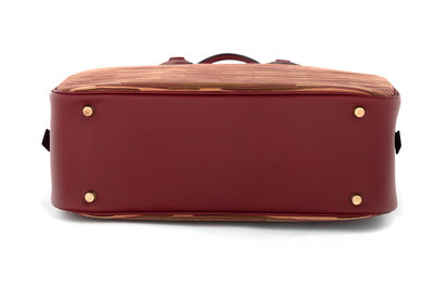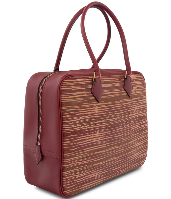Vibrato leather Plume bag in red, brown, and pink trimmed in rouge swift leather, dual top leather handles, and top zipper closure.