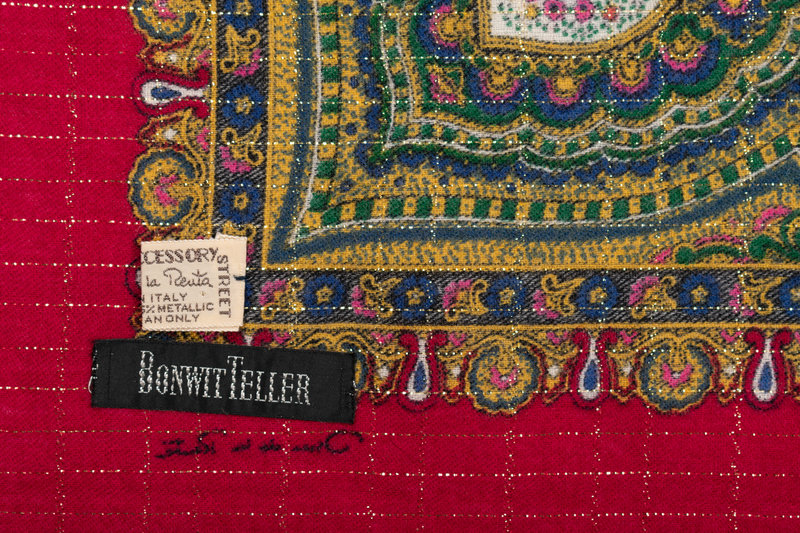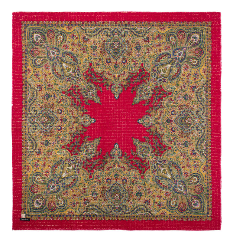 Red paisley printed scarf with gold metallic thread and unfinished edges.