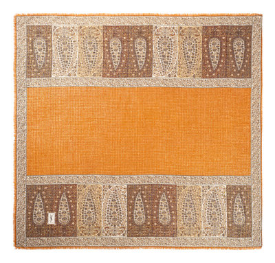 Brown and gold paisley print scarf with gold metallic thread grid and unfinished golden yellow edges.