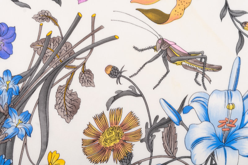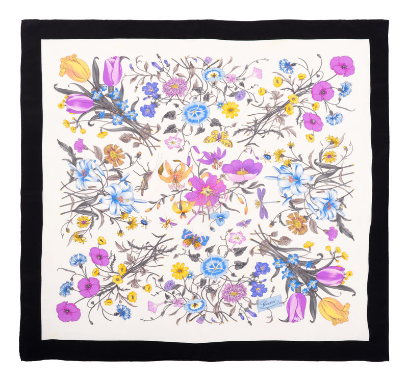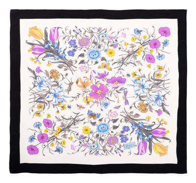 White silk scarf with blue, purple, and yellow floral and insect print, and black border.