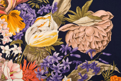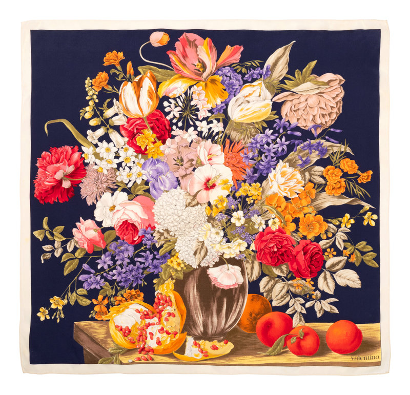Blue silk scarf with floral arrangement print and beige border.
