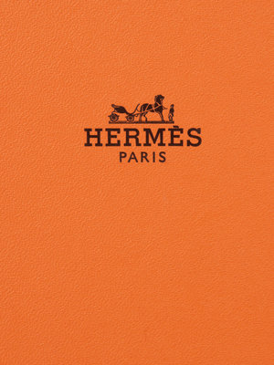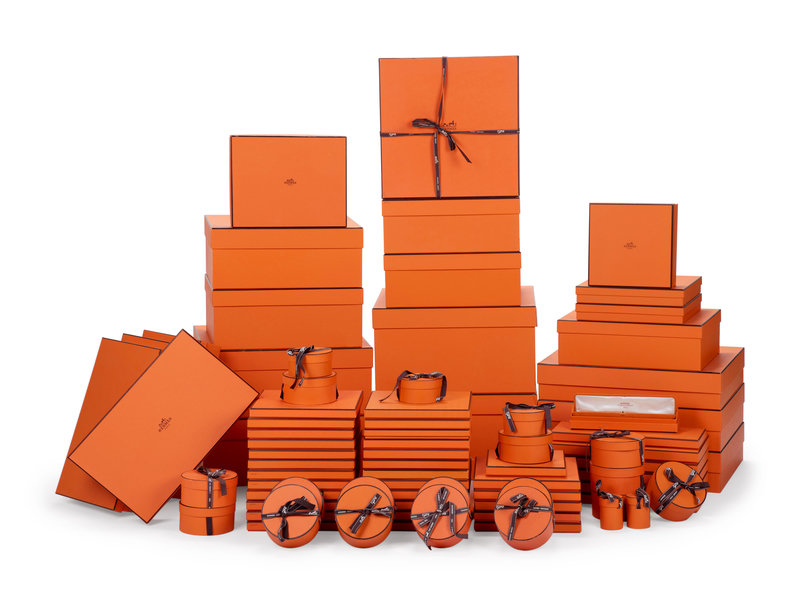Orange paper covered cardboard boxes with iconic brown printed lining and stamps, and one orange velveteen hinged watch box.