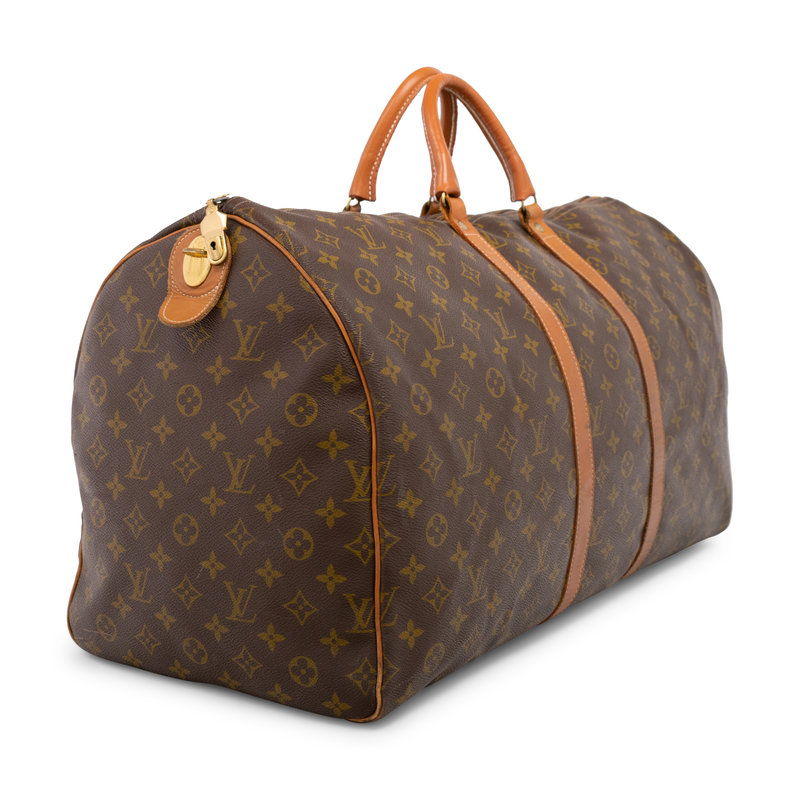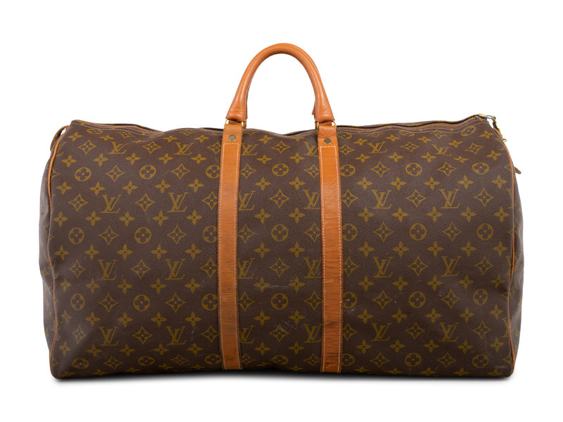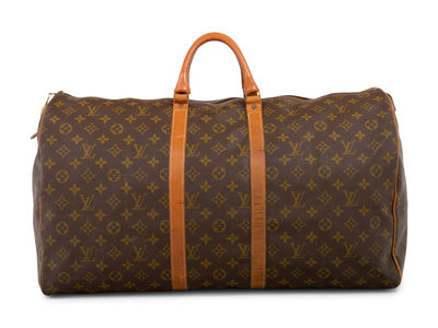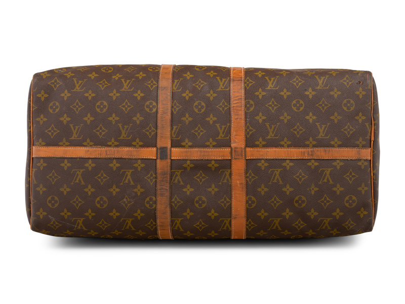 Brown Monogram canvas keepall 55 bag trimmed with leather straps, rolled leather top handles, and adjustable shoulder strap with shoulder guard.