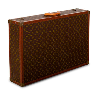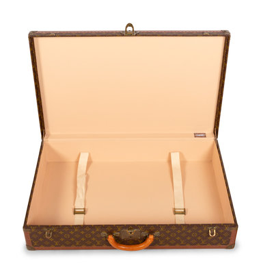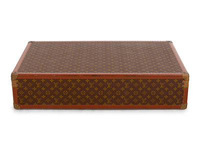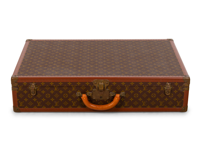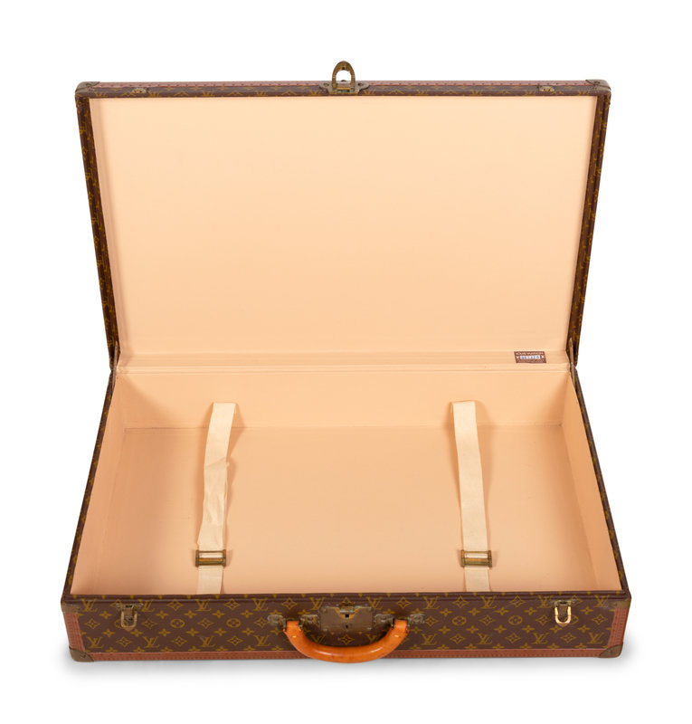 Louis Vuitton Monogram Alzer 80 hard-sided suit case with top rolled padded leather handle and brass lock plate with latch closures.