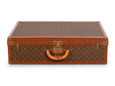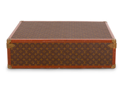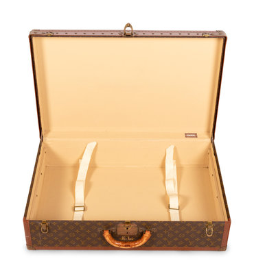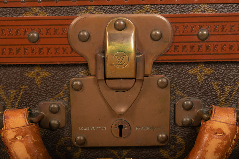 Louis Vuitton Monogram Alzer 75 hard-sided suit case with top rolled padded leather handle and brass lock plate with latch closures. "EL" is stamped under the lock plate in gold lettering.