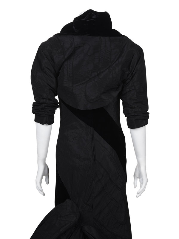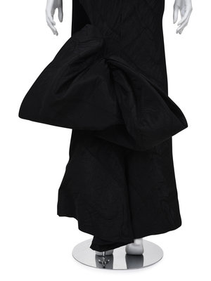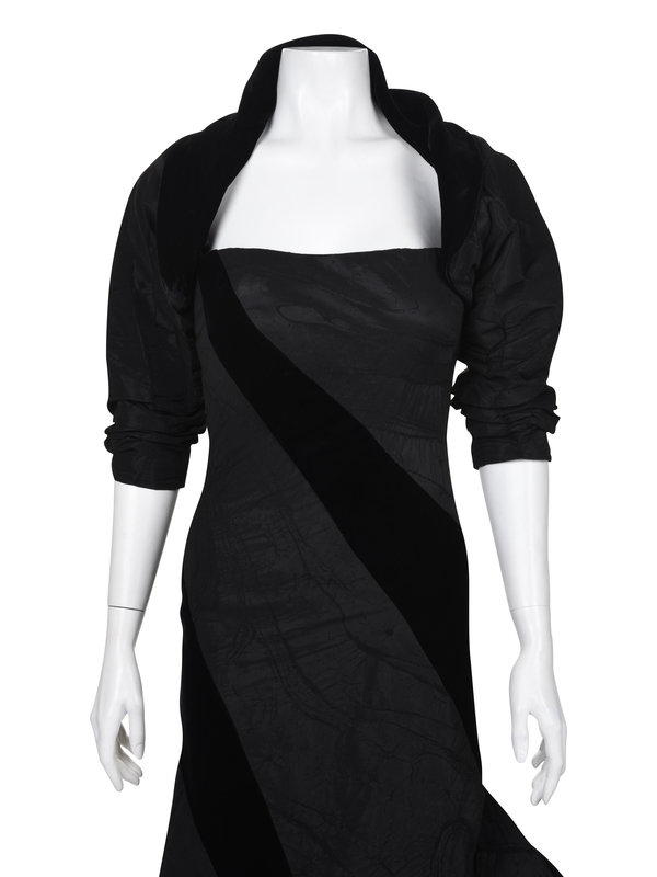 Black moiré and velvet strip strapless mermaid style dress with back large bow and center back zipper closure; paired with matching ruched bolero jacket.