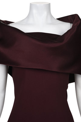 Burgundy acetate/viscose blend crepe back satin maxi sleeveless dress with an off-the-shoulder soft-sculpted open neckline and flared hem.
