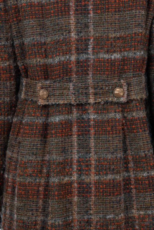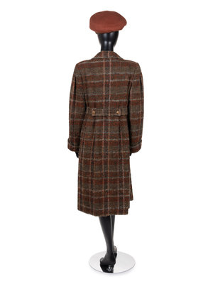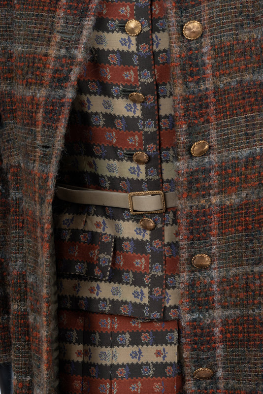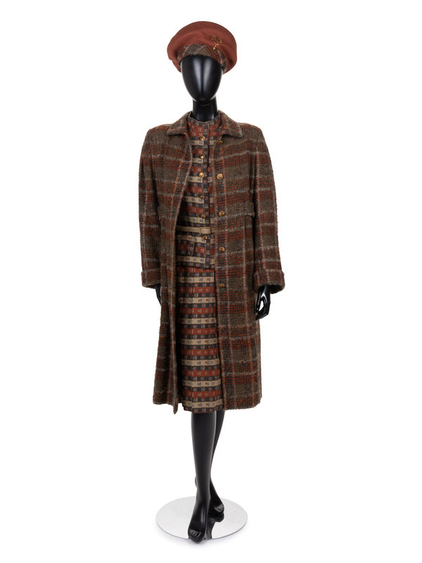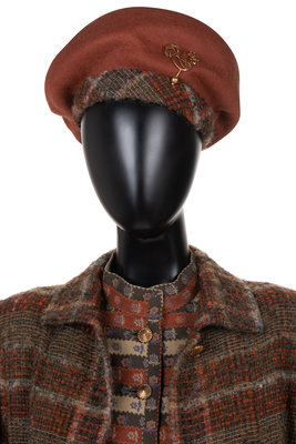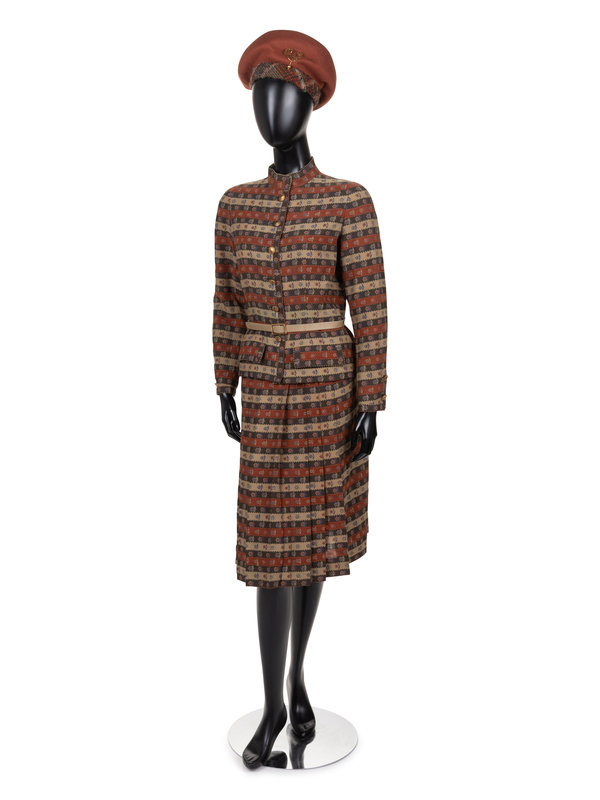 Three-piece skirt ensemble including a green, gray, and orange plaid tweed coat with rolled collar, cuffed long sleeves, pleated side panels with attached waist cinch, inseam side pockets, and front gold-tone rope edged buttons; paired with a green, beige, and orange stripe and floral print jacket with military-style collar, nipped waist with a beige leather belt, front hip pockets, and center front button closure, a matching pleated skirt with left side zip closure, and orange felt beret brimmed with matching tweed band, and rooster pin.