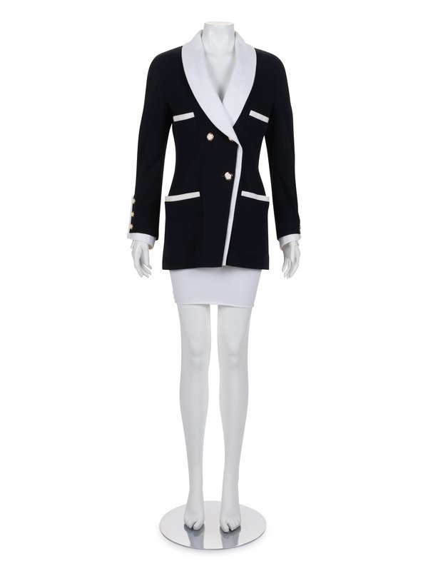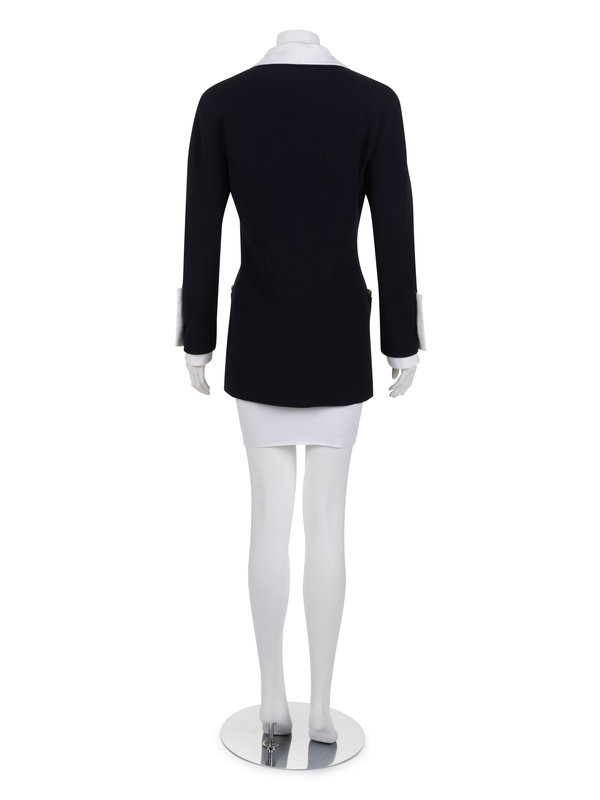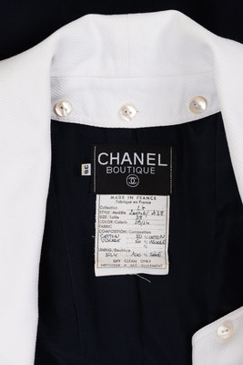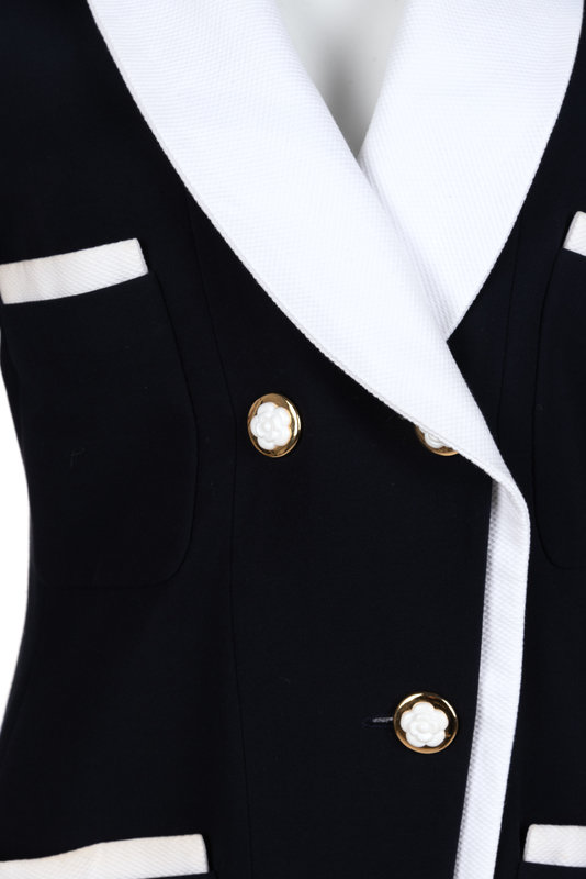 Navy cotton/rayon blend gabardine double breast jacket with detachable white pique shawl collar and cuffs, trimmed pockets, and front camellia flower button closure.