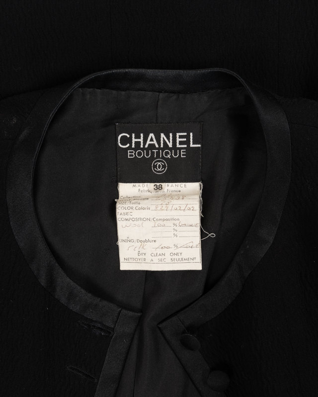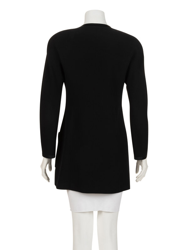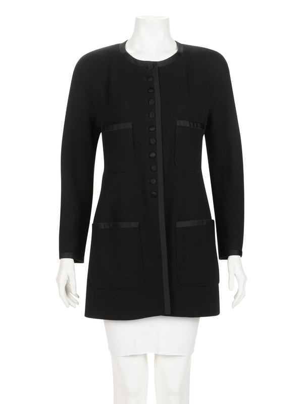 Black wool crepe jacket trimmed with black silk satin, jewel neckline, built-in sleeves, four front patch pockets, and center front button closures.