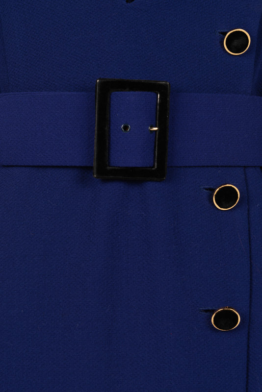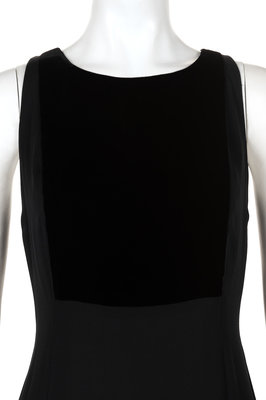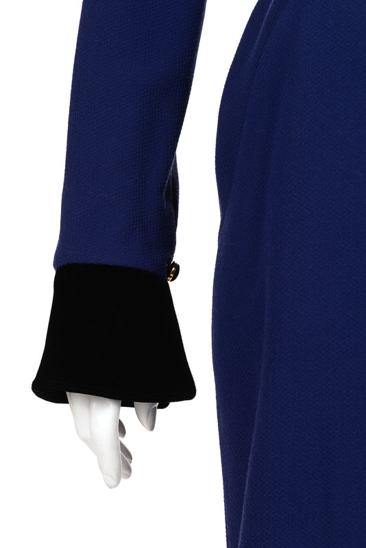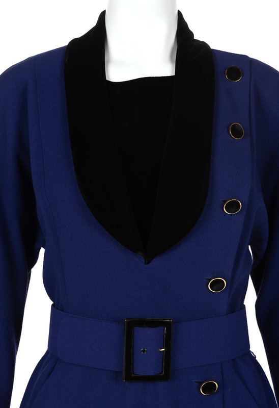Purple wool wrap dress trimmed in black velvet with shawl collar, elasticized waistband, velvet cuffed long sleeves, and left side button closure with a wide belt; paired with black velvet paneled sleeveless slip with center back zipper closure.