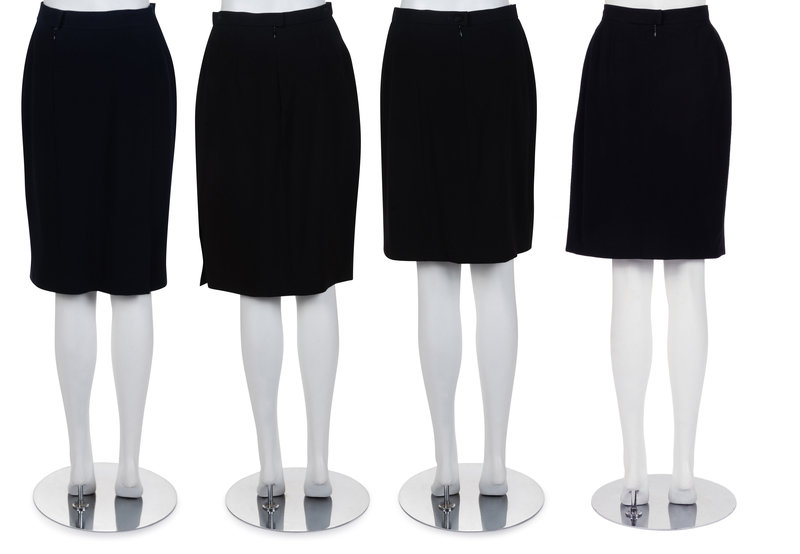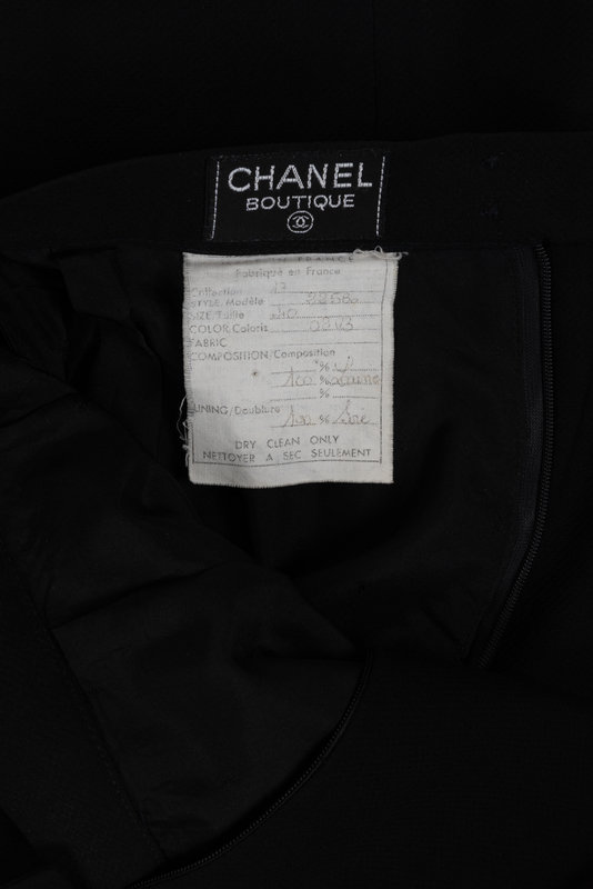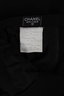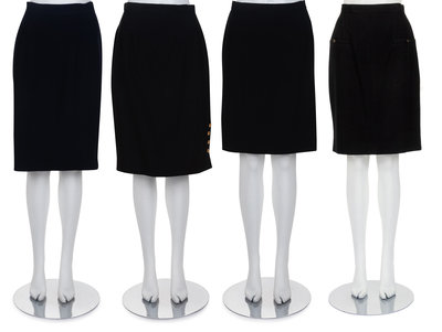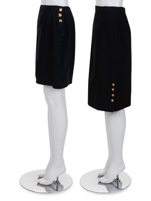 Black wool A-line skirt with an invisible zipper closure on the back panel as well as a lower left buttoned side closure.
