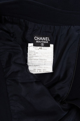 Navy blue wool A-line skirt with a hidden buttoned side closure and back zipper closure.