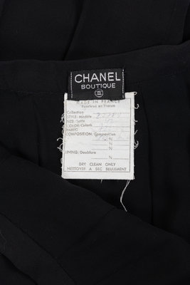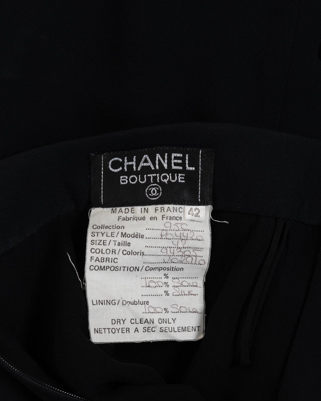 Black silk pleated maxi skirt with a back zipper closure and two buttons.