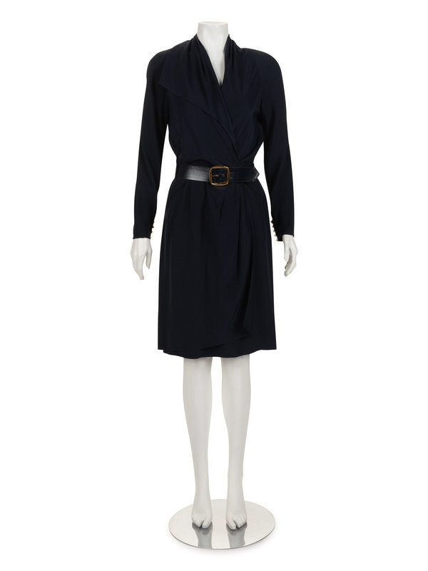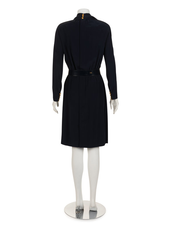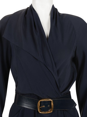 Navy crepe wrap-style long sleeve dress with draped collar, gathered skirt, and center back button closures with matching leather-backed belt with rectangular buckle.
