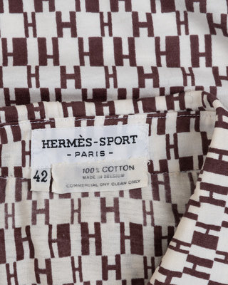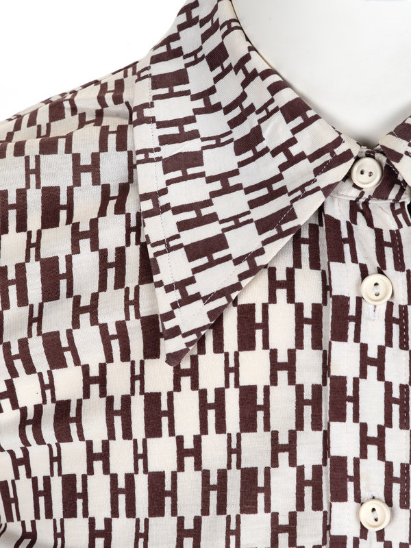 White cotton knit button down shirt with brown "H" pattern print, wide pointed collar, and front button closure.