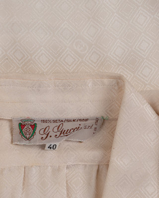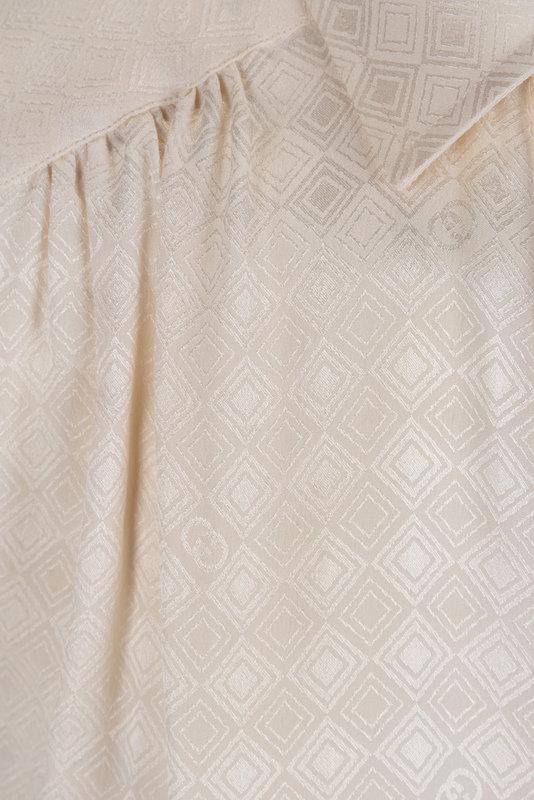 Ivory silk diamond weave satin blouse with gathering on the sleeves, yoke, and cuffs, and front hidden button closure.