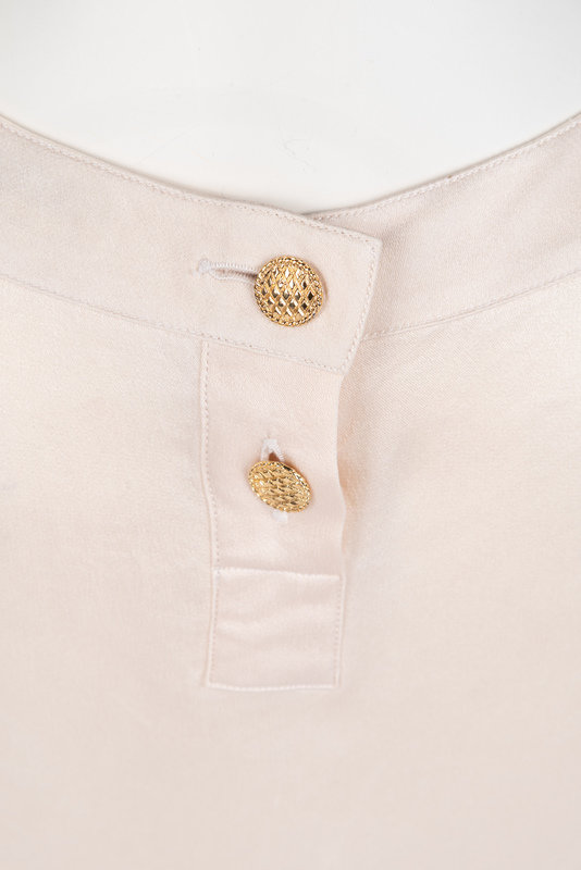 Ivory silk sleeveless shell top with a back middle closure secured with two decorative buttons.