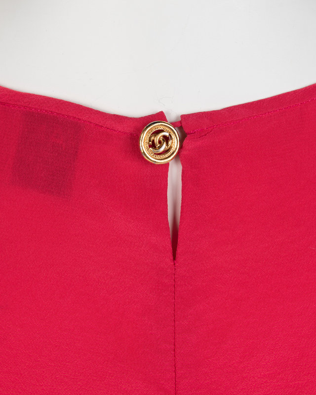 Hot pink silk sleeveless top with a center back neckline one-button closure.