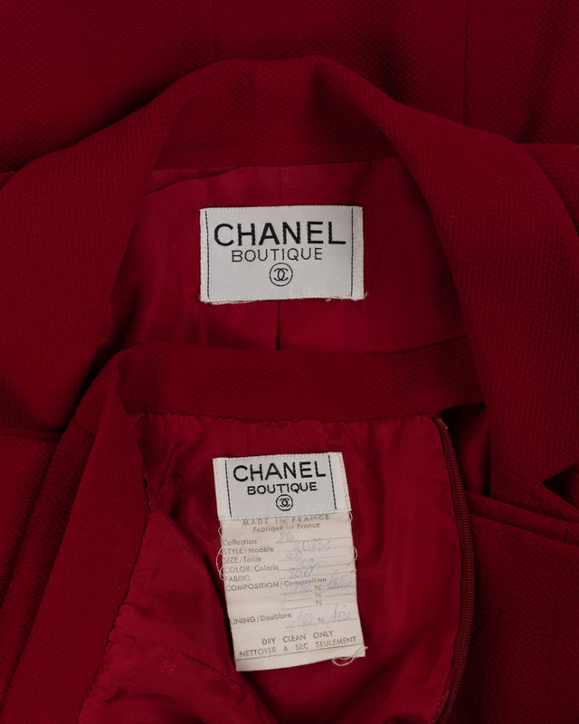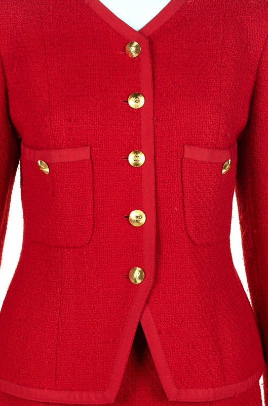 Bright red wool tweed two-piece skirt suit including a fitted long sleeve jacket with clean neckline, two front pockets, and front button closure; paired with matching straight-fit skirt with center back zipper closure.