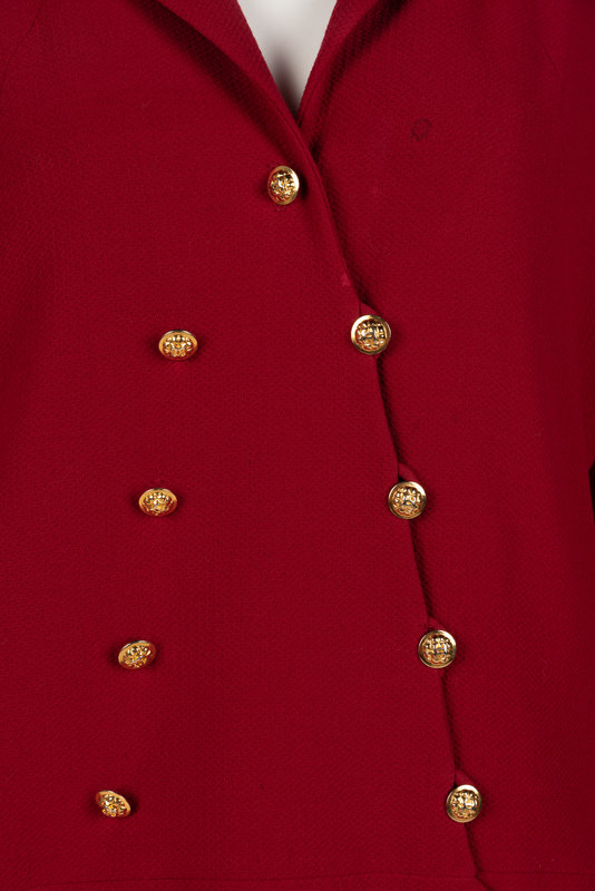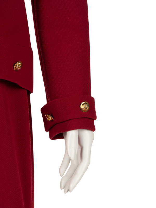 Dark red wool tweed two-piece skirt suit including a notched lapel jacket, cuffed long sleeves, and front double breast button closure; paired with matching straight-fit skirt with center back zipper closure.