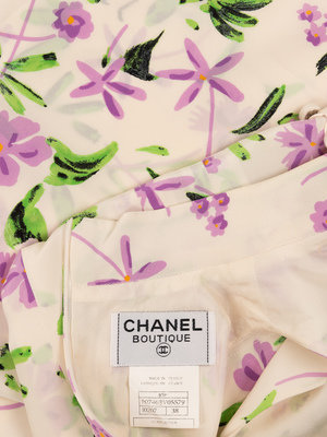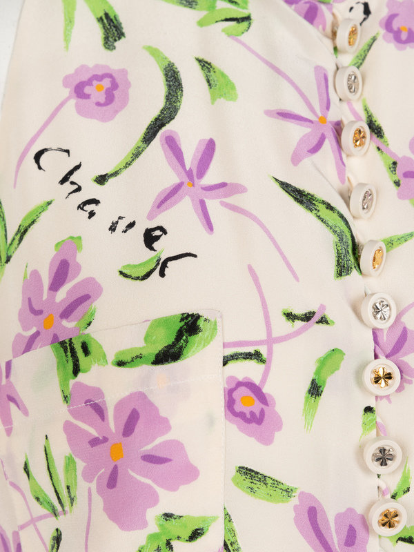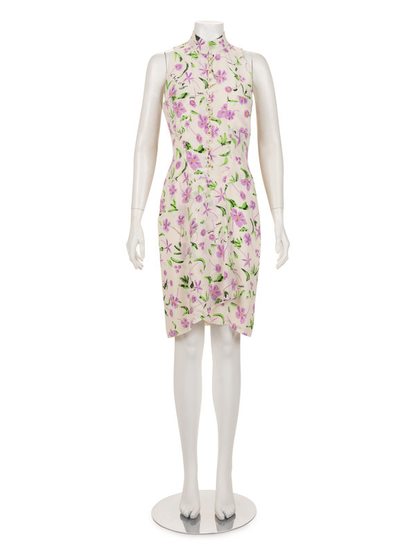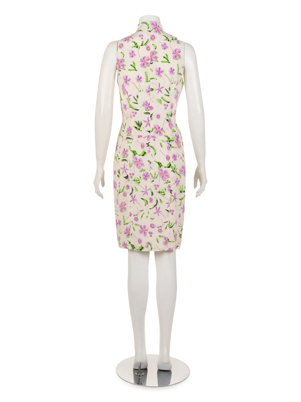 White silk crepe sleeveless dress printed with purple and green flowers, Nehru collar, front chest patch pockets and silver-and gold-tone clover button detail, wrapped skirt, and center back zipper closure.