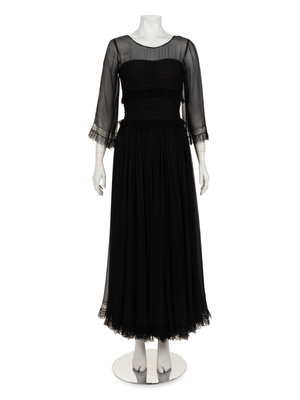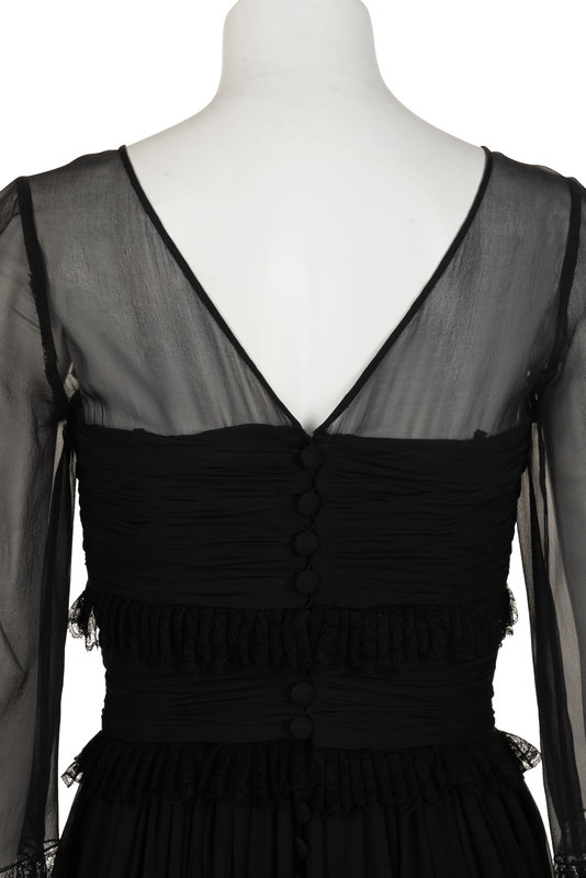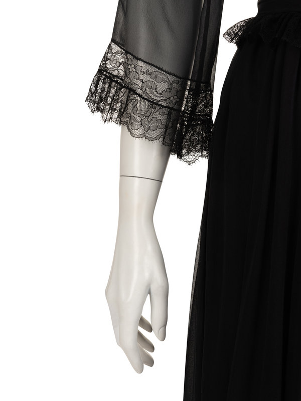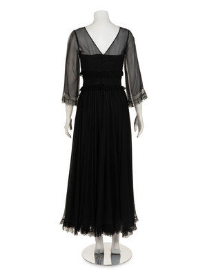 Black silk chiffon evening dress with sheer top shoulders, 3/4 lace-trimmed sleeves, gathered structured bodice with lace under the bust and waist, full gathered skirt hemmed in lace, and center back zipper and button closure.