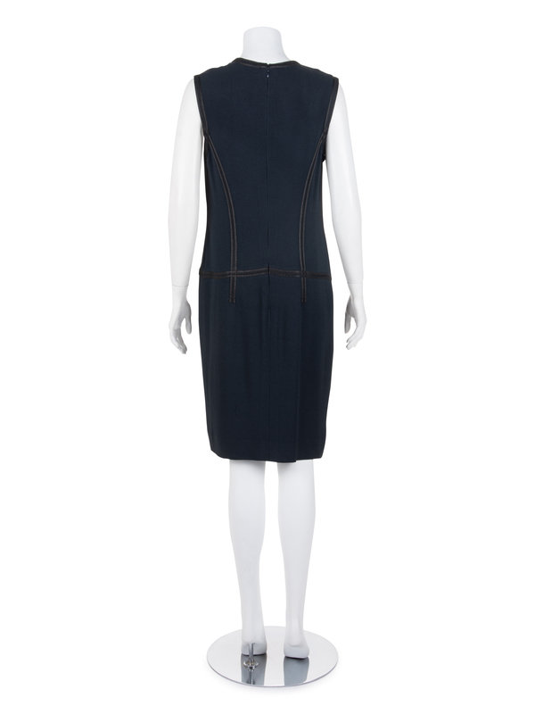 Navy acetate/rayon blend crepe double breast sleeveless dress trimmed in black braid and center back zipper closure.