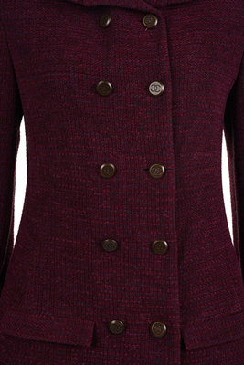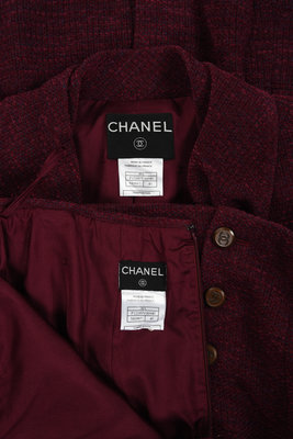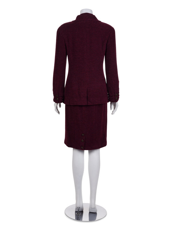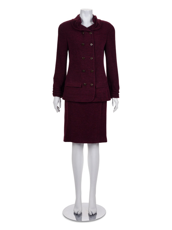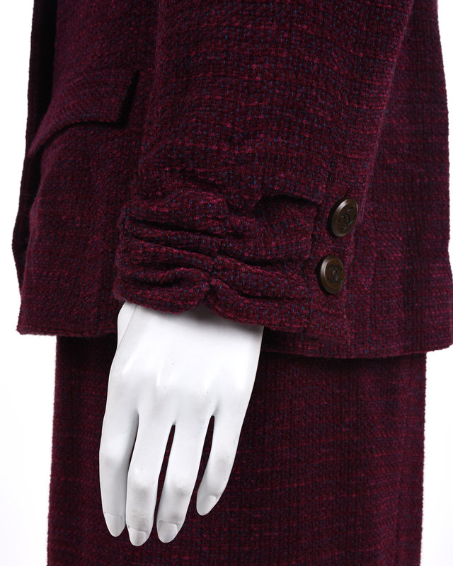 Chanel purple wool blend chenille two-piece skirt suit including a double breast jacket with ruched collar and sleeves, front flap pockets, and button closure; paired with matching straight-fit skirt with center back zipper closure.