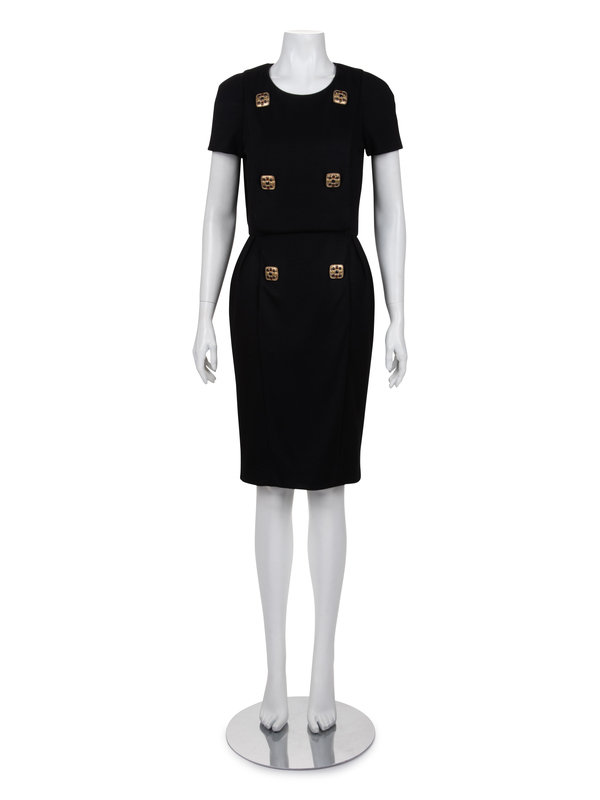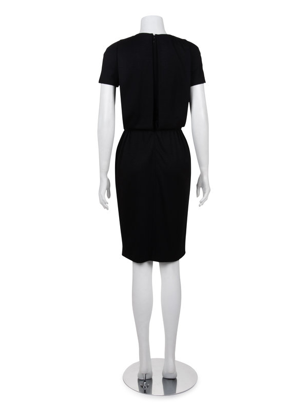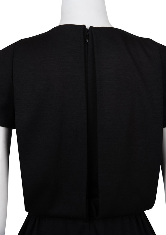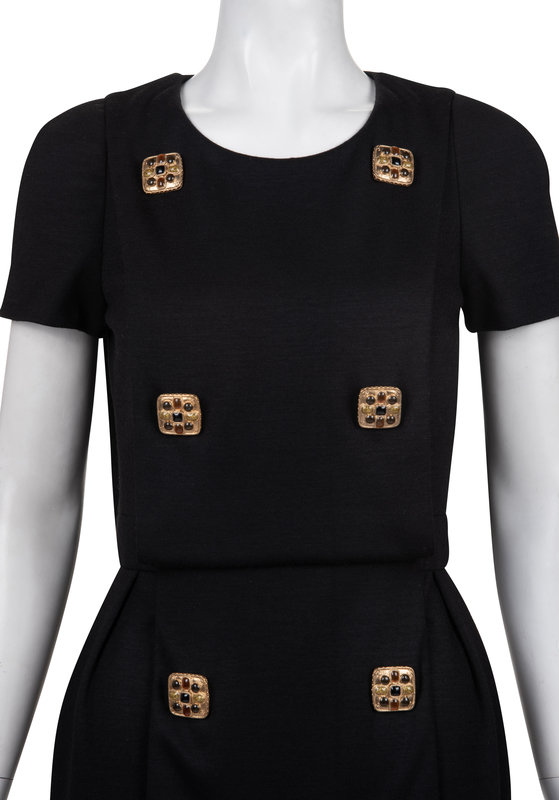 Black cap-sleeved wool knit jersey dress with double breast paneled front with jeweled buttons, and pleated skirt waist, and center back zipper closure.