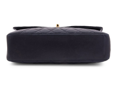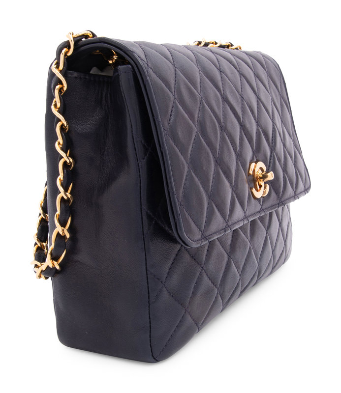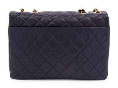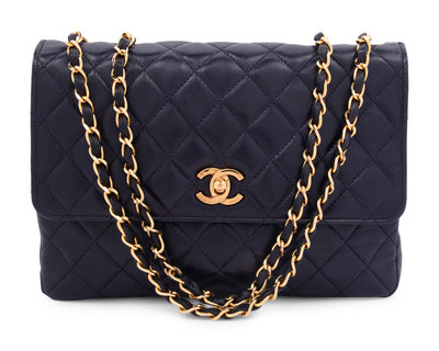 Navy leather quilted flap bag lined with red leather, gold-tone metal chain and braided leather dual handles, and front CC turn-lock closure.