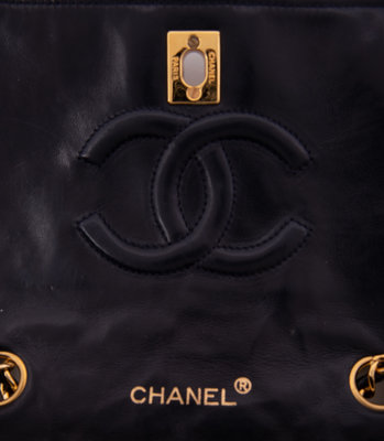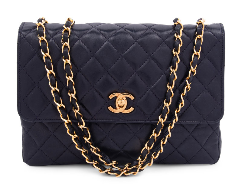 Handles: Gold-tone metal chain and braided navy leather dual top handles that adjust into a shoulder strap